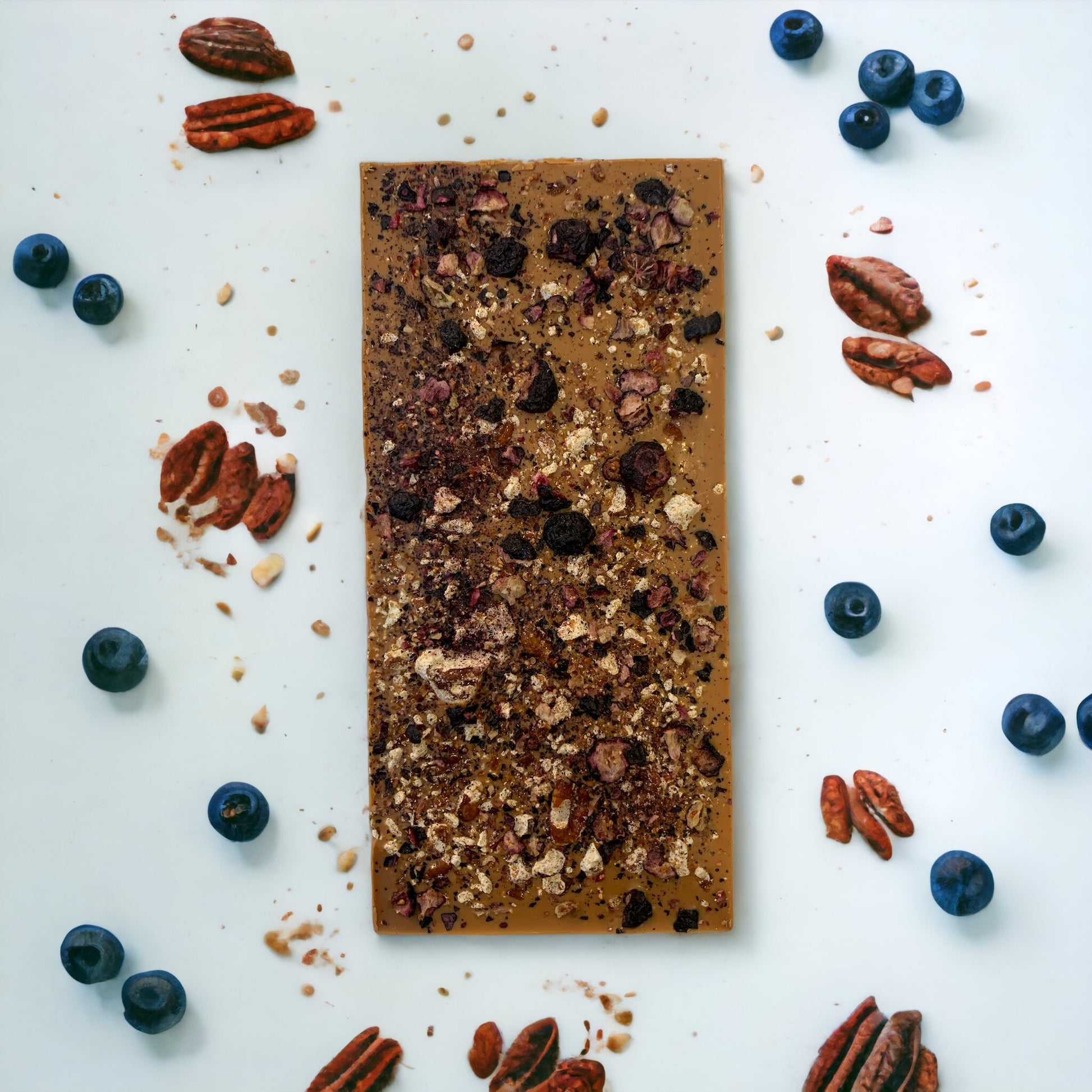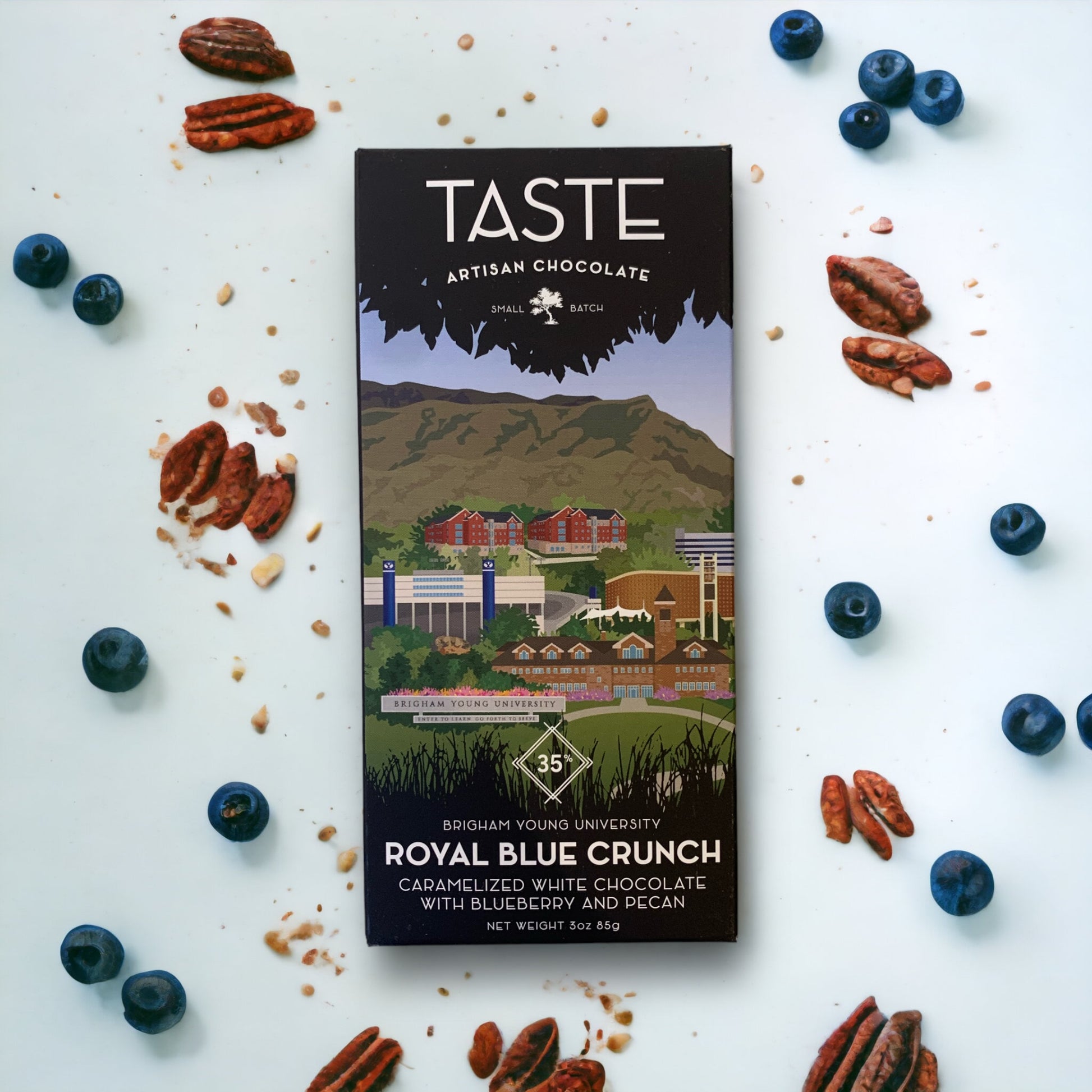 Introducing Royal Blue Crunch – a mix of caramelized white chocolate, candied pecans, and blueberries. Enjoy the sweet caramel flavor of the white chocolate combined with the nutty and tart flavors of the pecans and blueberries.