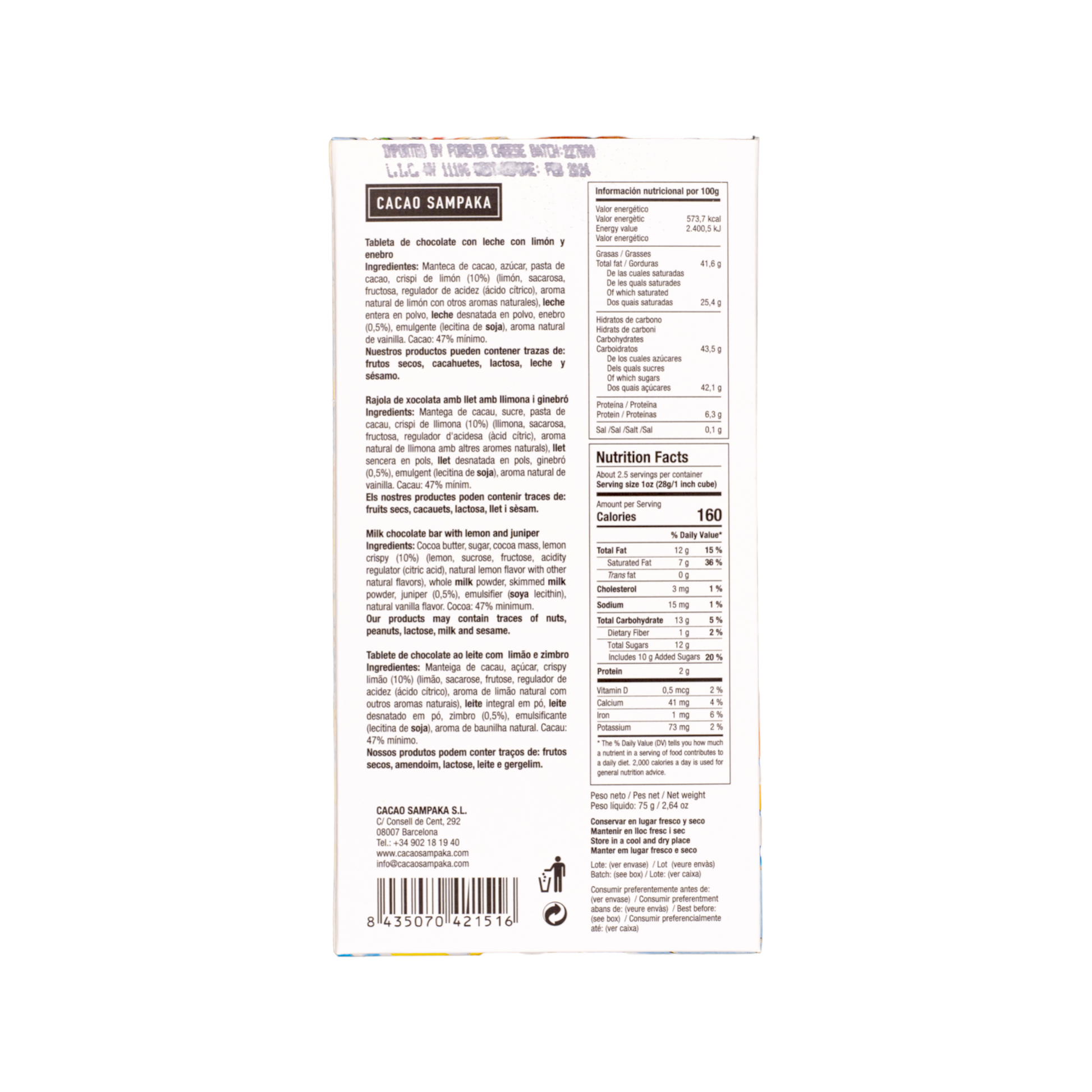 chocolate couverture with milk(sugar, cocoa butter, whole milk powder, cocoa mass, skimmed milk powder, emulsifier soyalecithin, natural vanilla flavor), cocoa mass, lemon crispy (lemon, saccharose, starch, maltodextrin, citric acid E-330, natural flavor, fructose), cocoa butter, juniper.