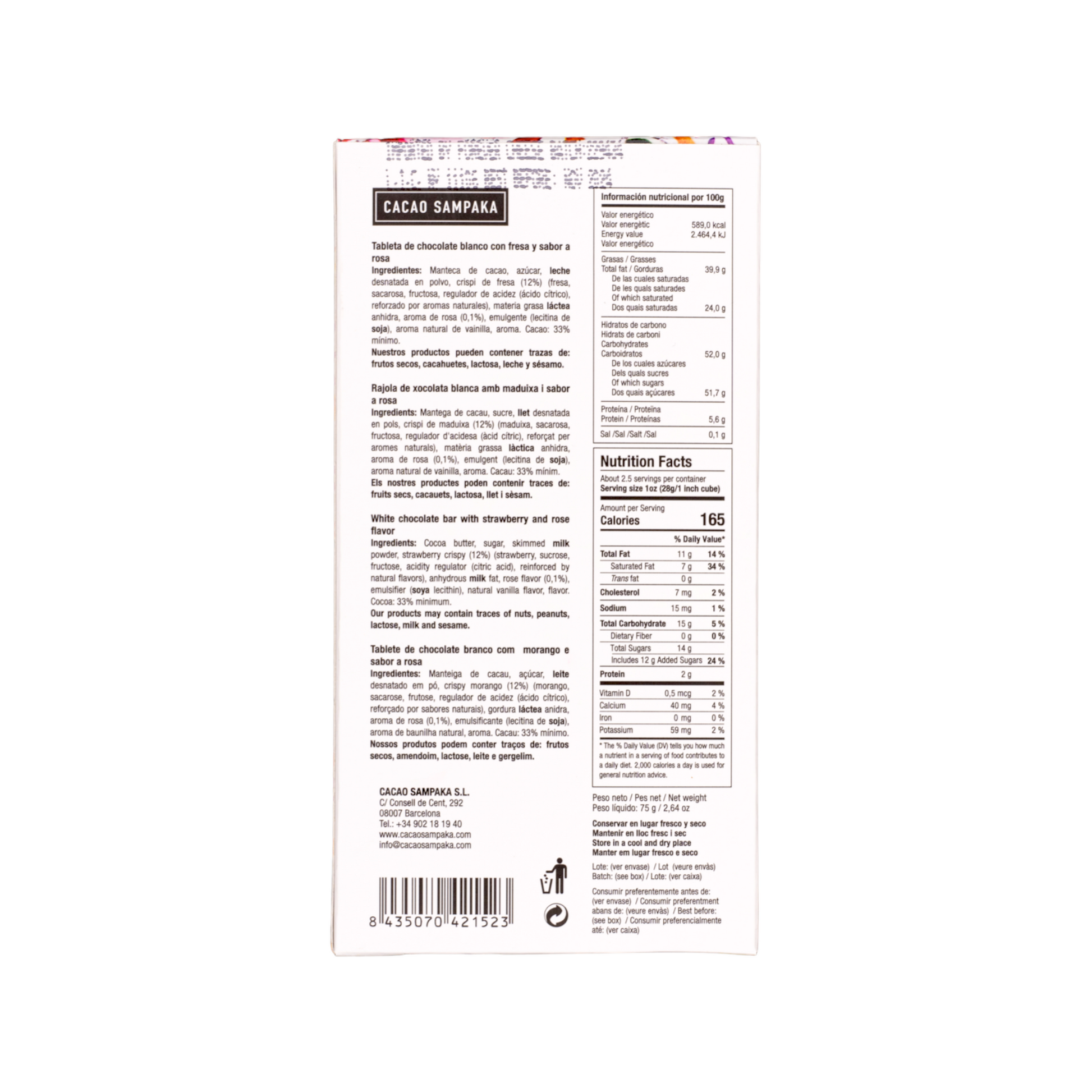 Ingredients: sugar, cocoa butter, skimmed milk powder, milk fat, strawberry, fructose, rose flavor, citric acid, emulsifier soya lecithin, natural vanilla flavor.
