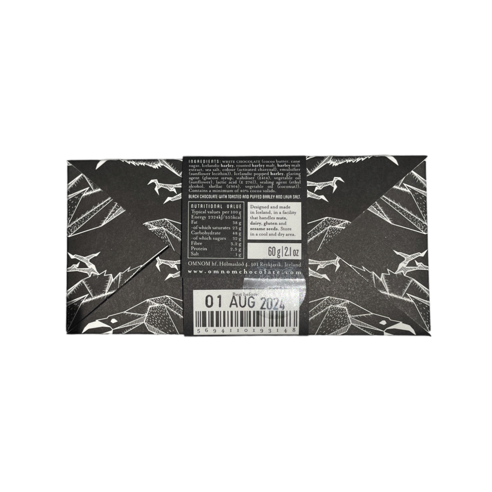 This chocolate is unlike any other. The lava salt from Saltverk is treated with activated charcoal, giving this bar its dramatic color. The savory notes in this chocolate are a result of the bar's inspiration--well roasted malted barley, usually used in brewing porters and stouts. The stark black choocolate is then topped with popped Icelandic barley, coated in chocolate.