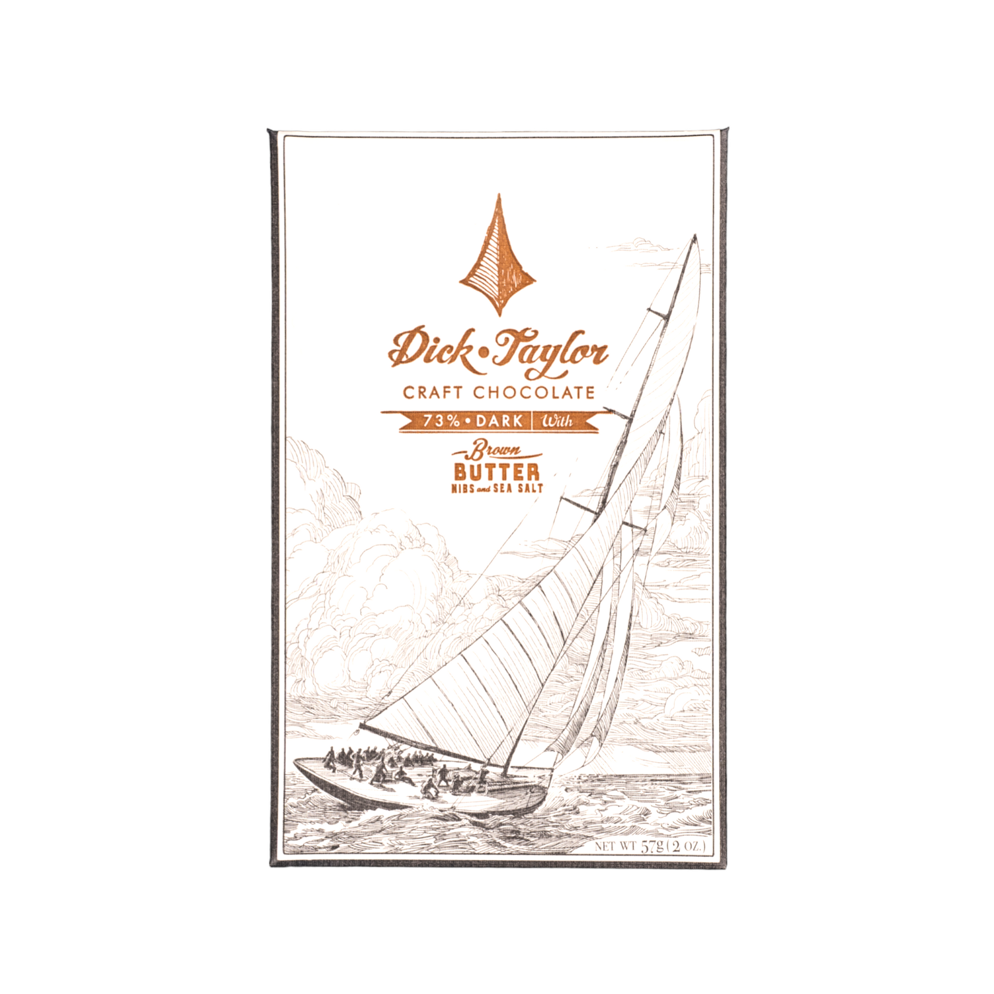 "Our BROWN BUTTER with NIBS & SEA SALT dark chocolate is a deliciously rich bar, made with Rumiano Organic butter that has been gently browned and blended into our 73% Northerner Blend dark chocolate. Our unique chocolate blend is made with cocoa beans from Madagascar and Brazil. Each bar is finished by hand with roasted cocoa nibs and sea salt to create a creamy and crunchy texture." - Dick Taylor