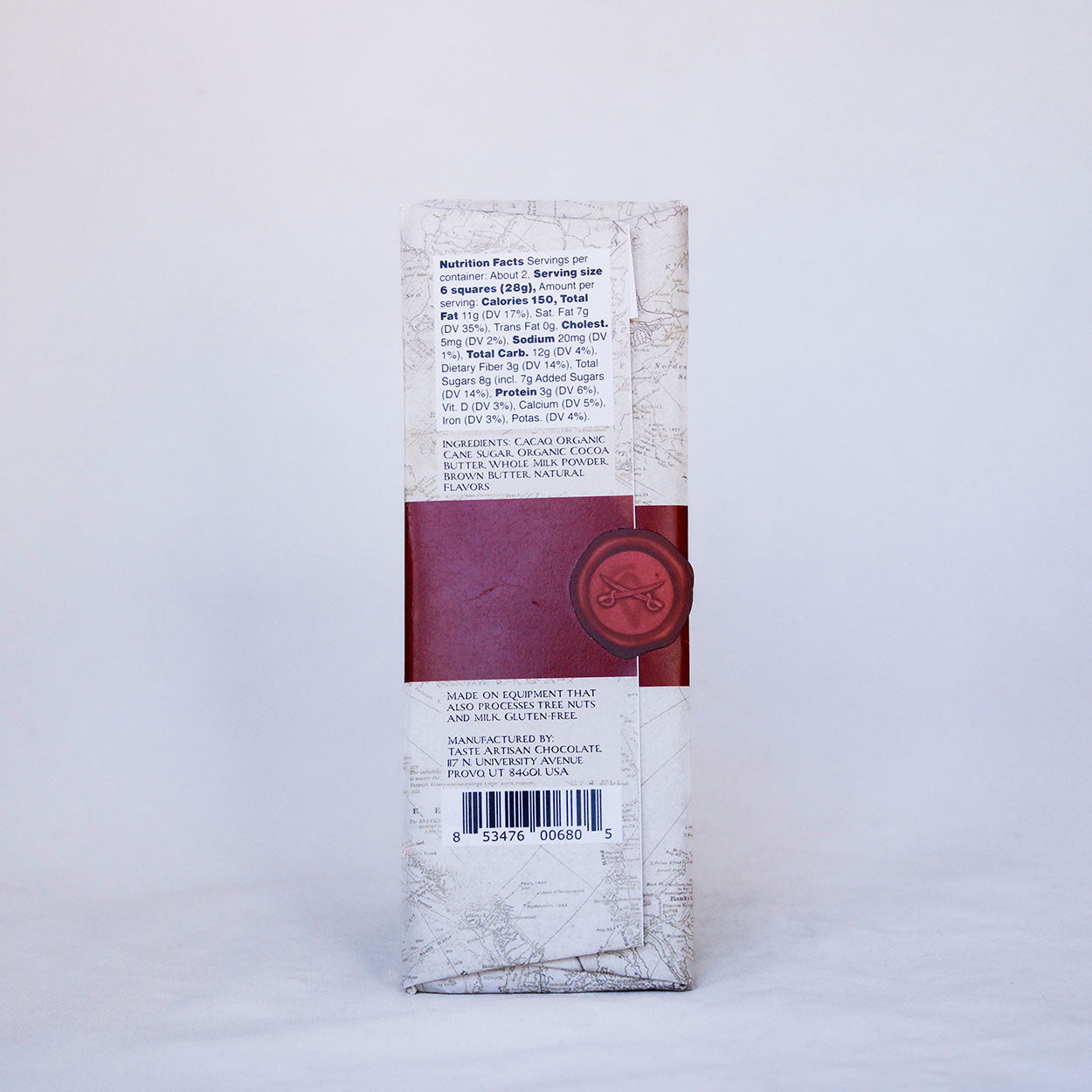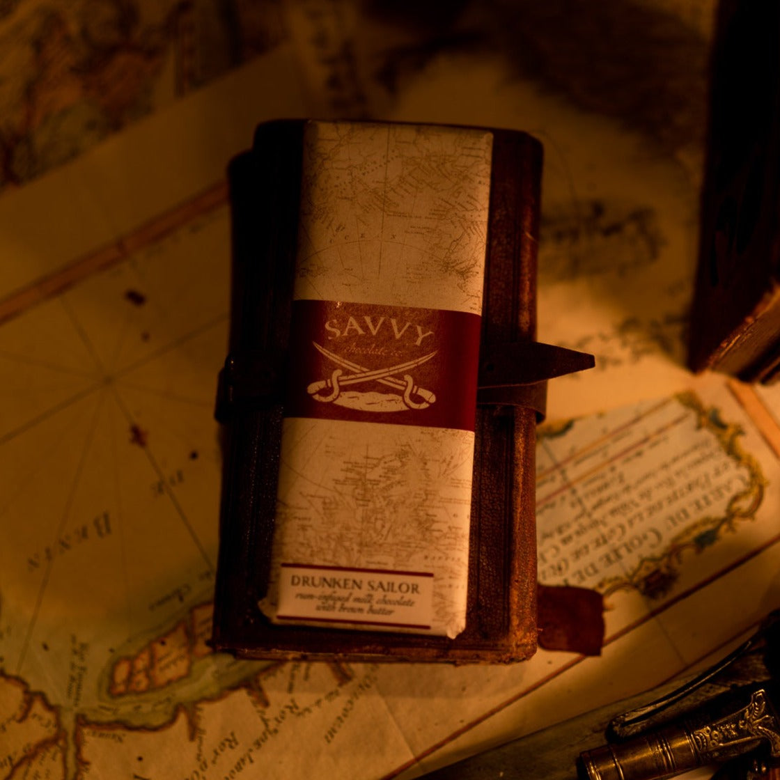 Fee-fi-fo-RUM! Wait, that’s pirate-y, right? Savvy’s Drunken Sailor Bar is a smooth blend of Brown Butter Milk Chocolate with Oak Barrel and Jamaican Rum extracts.