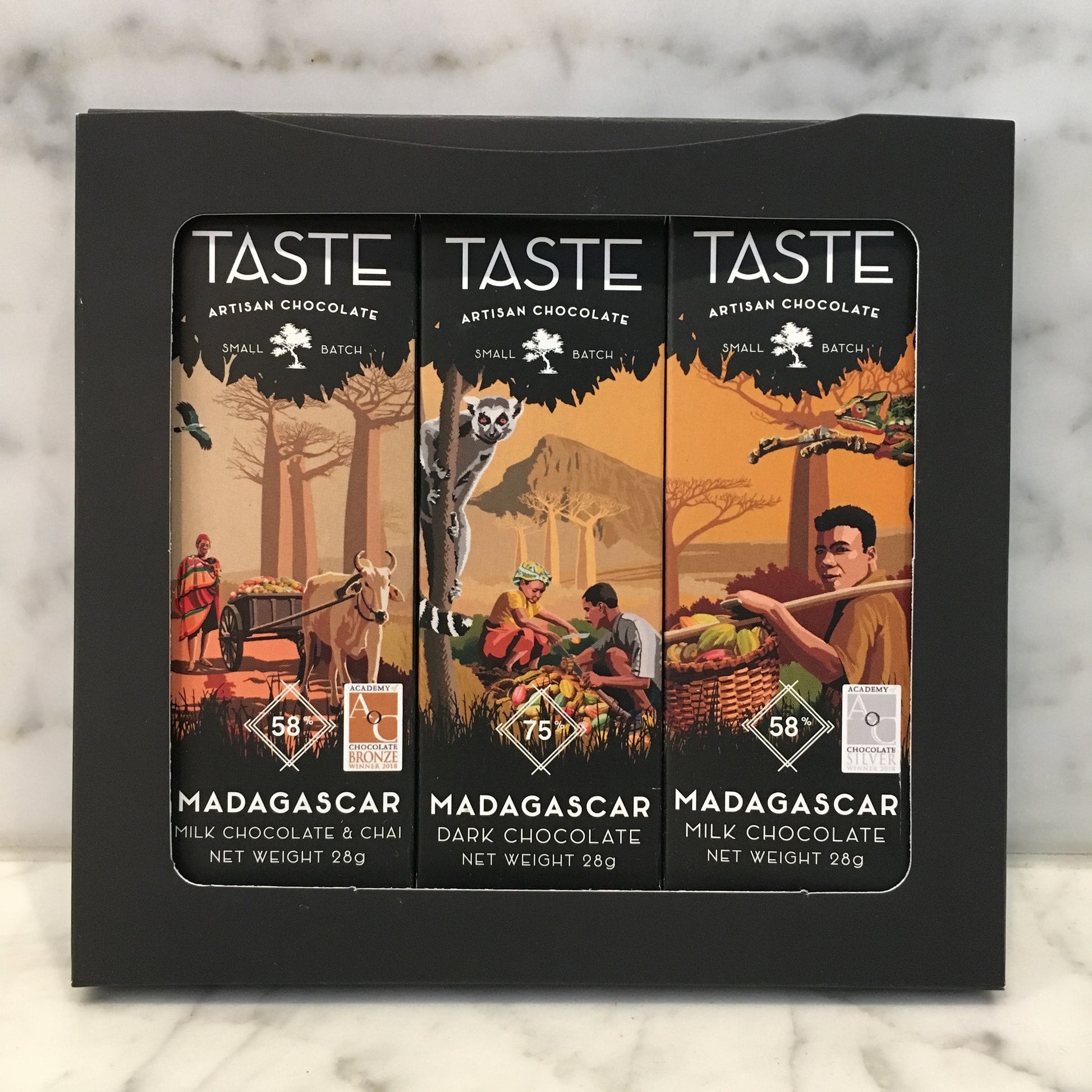 Travel the world of chocolate with a flight of 3 mini bars. Try all three exciting variations of our Madagascar bar!