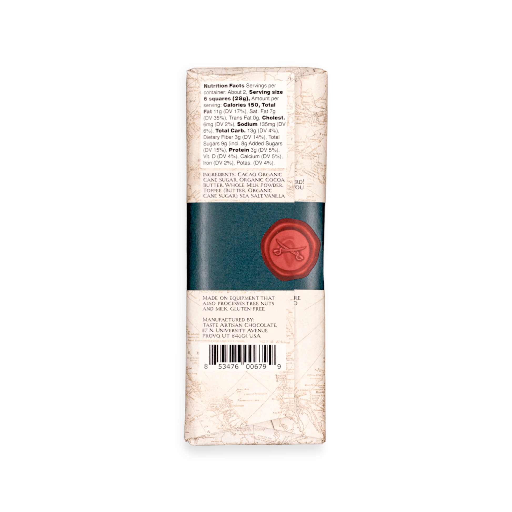 Yarrr, man overboard! This bar is salty so you don’t have to be. This Milk Chocolate is sprinkled with handmade toffee and real black sea salt from Cyprus.